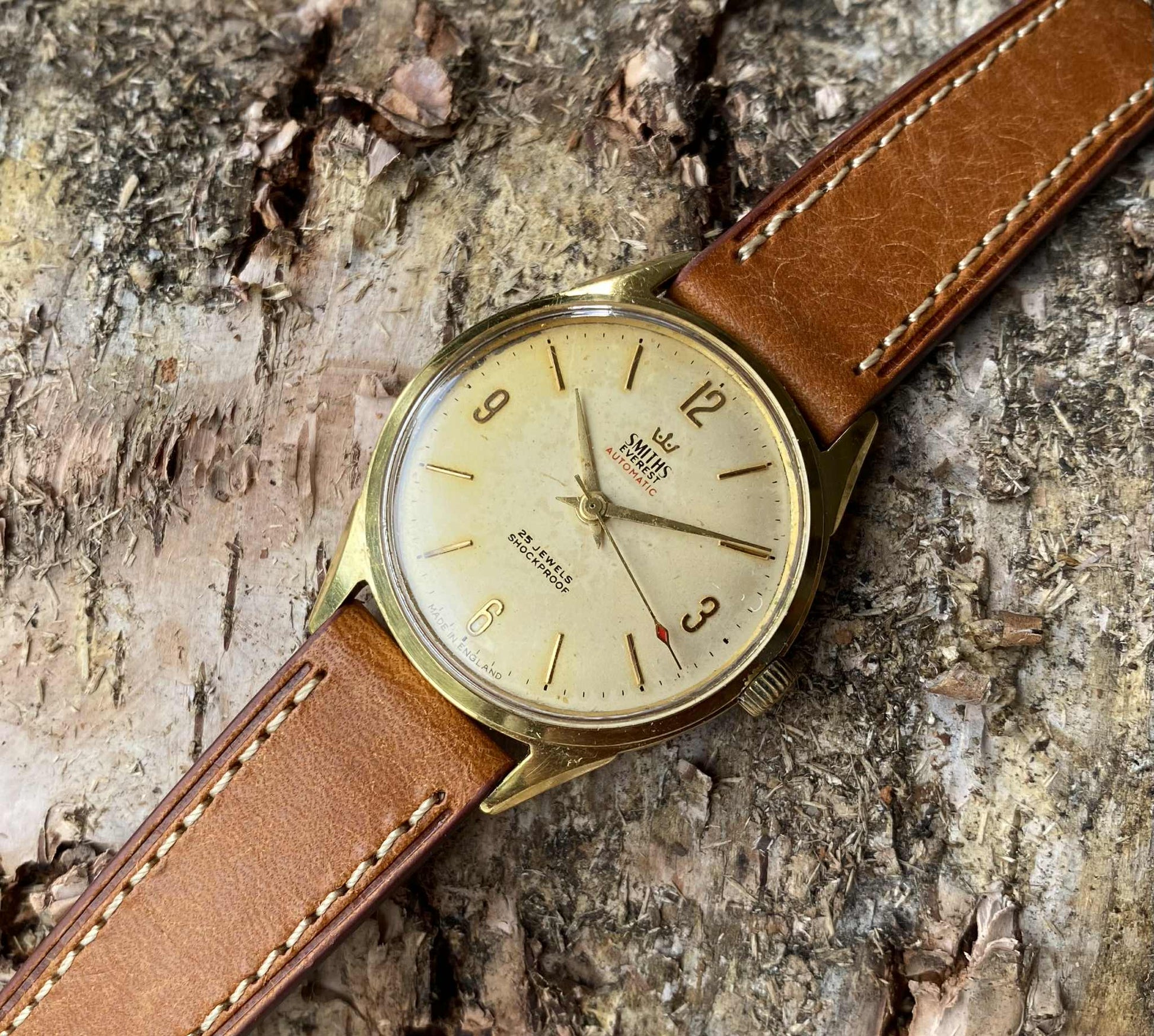 1965年頃に製造されたスミス「エベレスト」オートマチック。ケース径33mm、ラグ幅18mmの扱いやすいサイズで、英国らしい上品な存在感を放つ一本です。