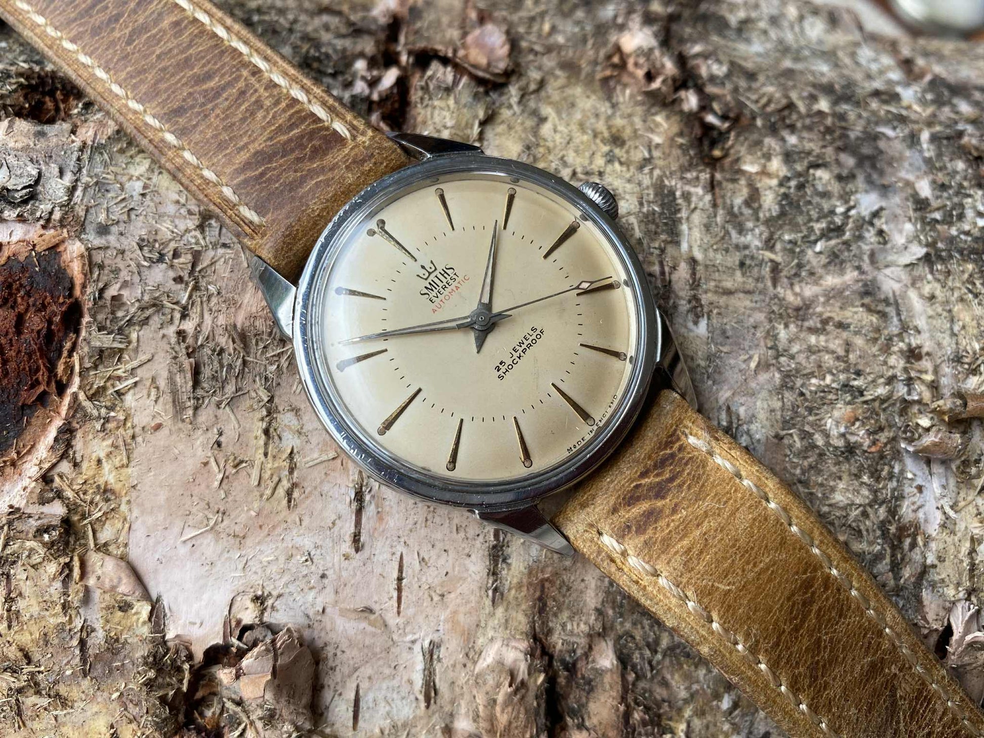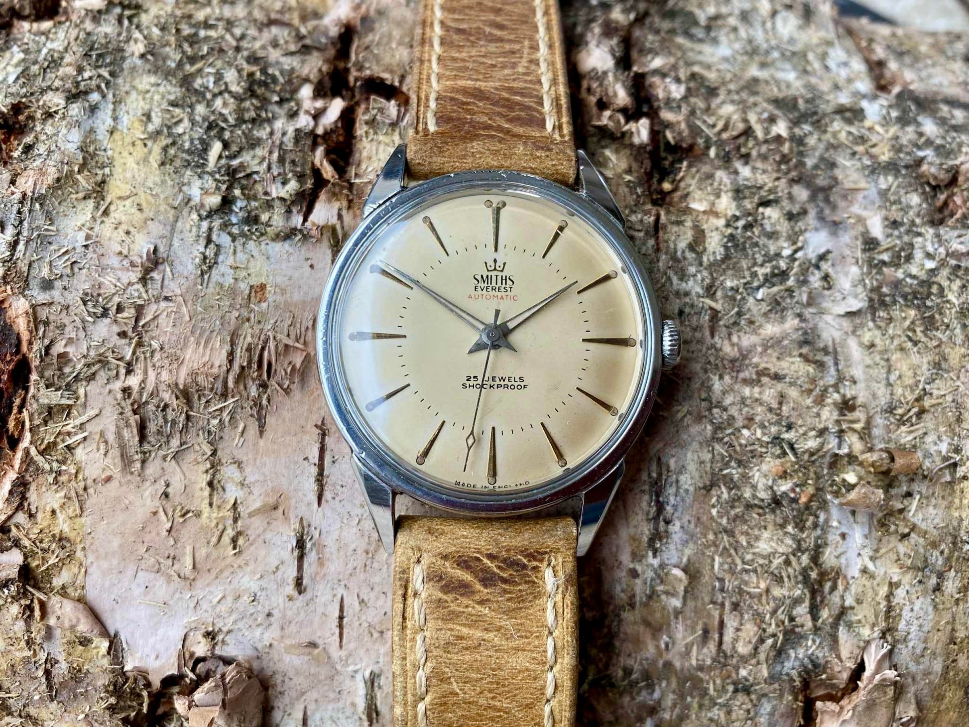 1964年頃に製造された、希少なスミス・エベレスト・オートマチックの一例です。チェルトナム工場製の 25石 Calibre 100 自動巻きムーブメント を搭載し、現在も良好に稼働しています。