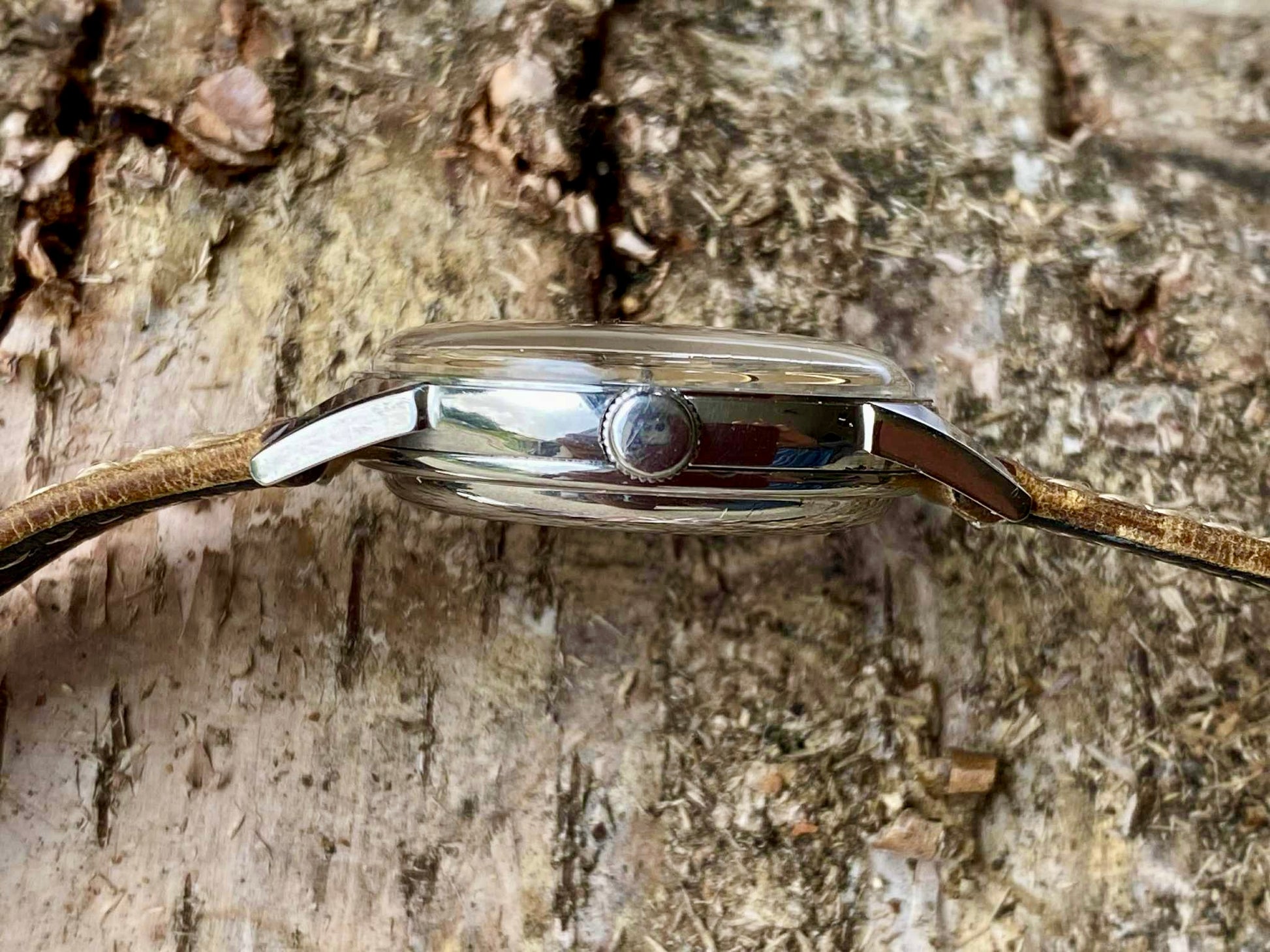 ケースはスミスとしては大型の 34mm径/18mmラグ幅。ステンレススチールケースは擦れが少なく、全体的に非常に良好な状態を保っています。文字盤には自然な経年によるわずかなパティナが現れており、ヴィンテージならではの深い味わいを楽しめます。