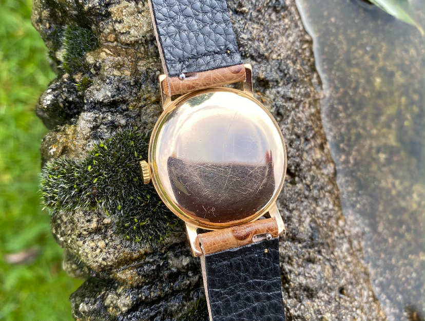 1958年製のスミス・インペリアルは、当時「英国外交官のための正装時計」とも称されたスタンドアウトなドレスウォッチです。ケース径は32mm、ラグ幅は17mmで、手首に上品に収まるサイズ感。ムーブメントはチェルトナム製のCalibre 100、19石を備えた機構で、フルサービス済み。前後ともにゴールドプレート仕様のケースが高級感を漂わせ、文字盤は当時の輝きを損なわずに保たれています。スミスの歴史的なドレスウォッチとして、現在でも高い評価を受ける逸品です。